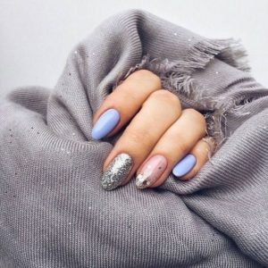 These almond nails ha a very gentle round shape and features a stunning combination of silver glitter and pastel blue shade.