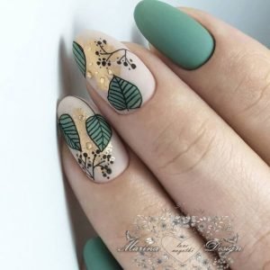 These matte almond nails features a unique leaves nail art with green and gold color combo.