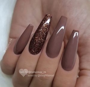 In case you are a fan of coffin-shaped nails, but you don’t want to go over the top this fall, these natural mocha shade nails will suit you best. Brown gel polish is used here to achieve a high gloss effect.