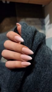 Simple and classy pink-nude color almond shaped nails.