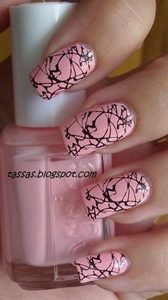 2) Put a bit of black polish onto the plastic bag and with a needle draw your lines by dragging out the “blob” of polish.