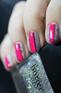 This unusual design will bring out the party princess in you! Be creative and do not be afraid to overlay different styles for a super original look. The glitter polish used here is from Butter London whilst for the pink we recommend their Flusher Blusher Nail Lacquer polish.