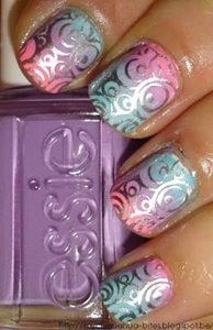 This style features a beautiful ombré of pink, purple and turquoise. You will definitely be “cool for the summer” with this cute look! For the silver swirls, UK-based site Sparkly Nails has got nail stickers (Arabian Swirls Nail Water Decals) that should do the trick!