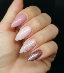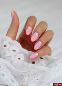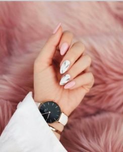 A French manicure with a difference – for this we recommend wearing acrylic nails to achieve the length shown in this picture (unless you are very lucky to have very long nails!). For the tips, do your own water marble look with two different pinks for a beautiful and feminine feel. This style will get your nails party-ready!