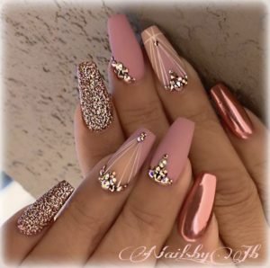 Dare to be different with some beautifully designed geometric shapes on your rose gold nails. This design isn’t for everyone, but it’s still pretty and we love how unique it looks. To be able to create this look you may have to be very talented, but it is possible! Try it out for yourself!
