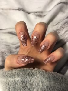 If some of our previous suggestions of designs have been a little too unique and ‘out-there’ you may be looking for something a little less crazy. Adding an ombre rose gold glitter design to a taupe and nude nail polish color looks great and super cute. If you’re feeling a little adventurous you can even try out having one nail all rose gold glitter!